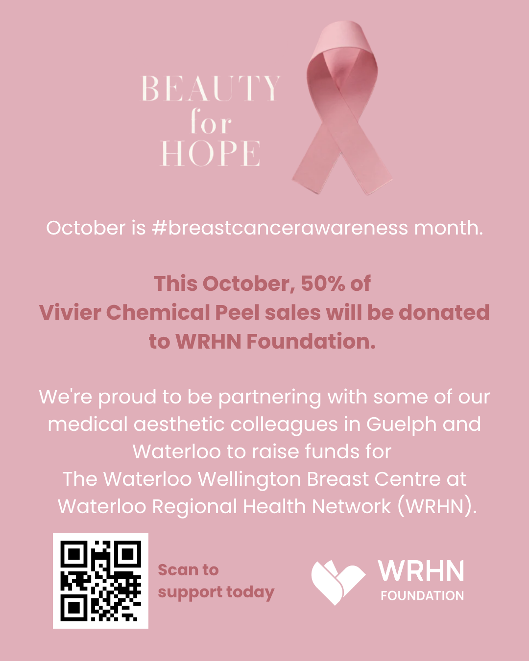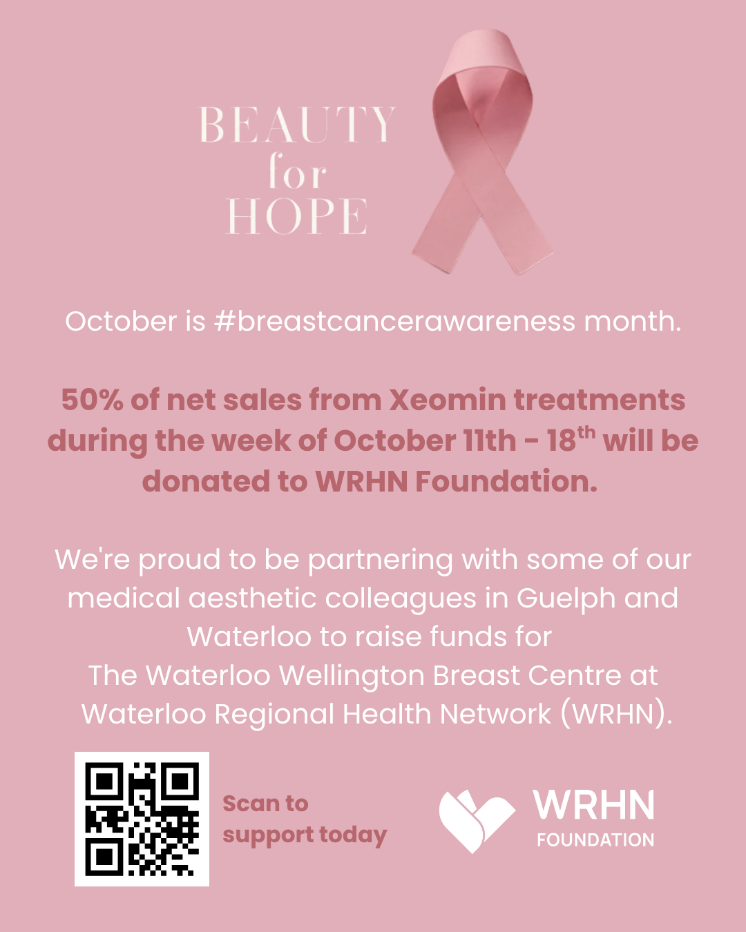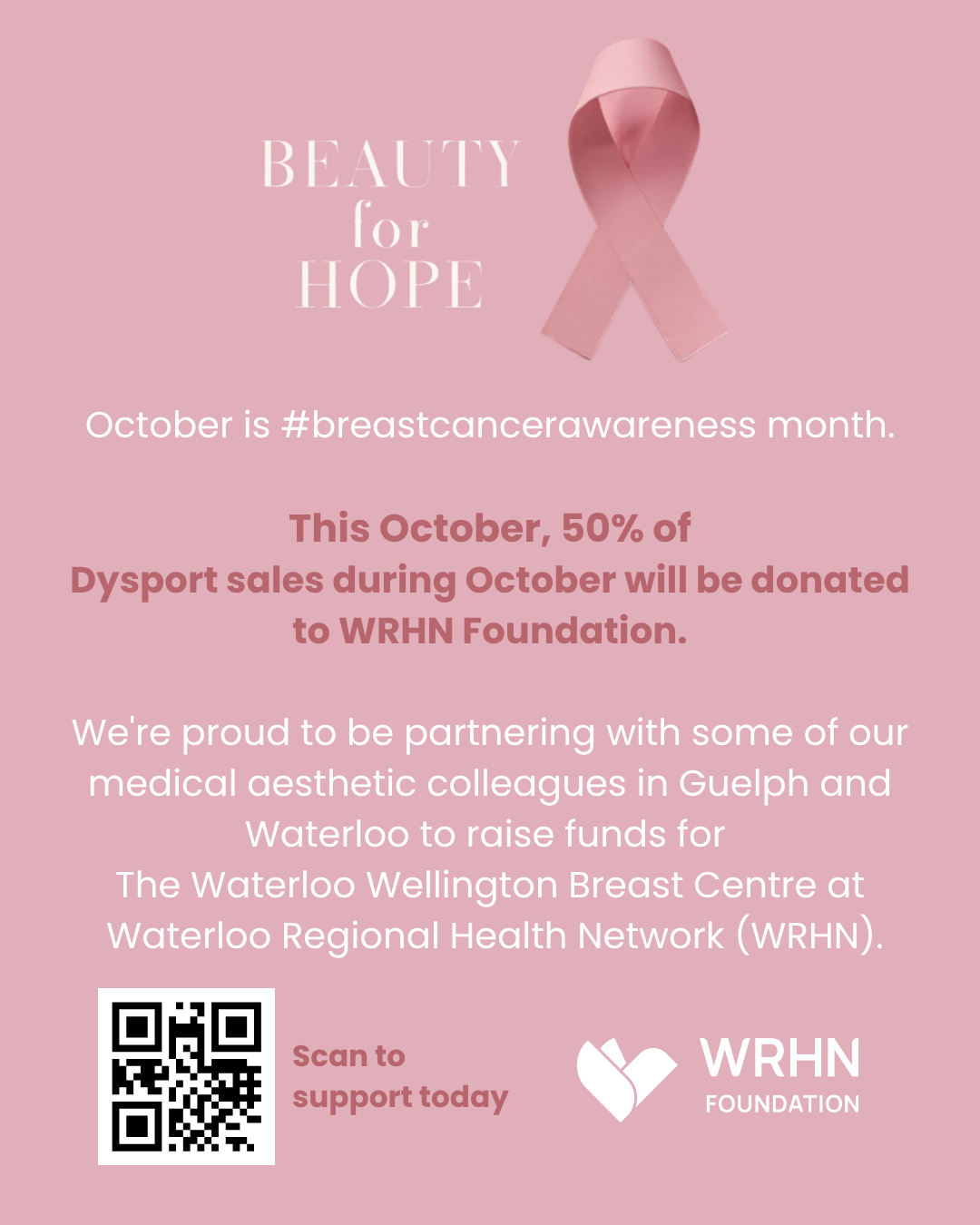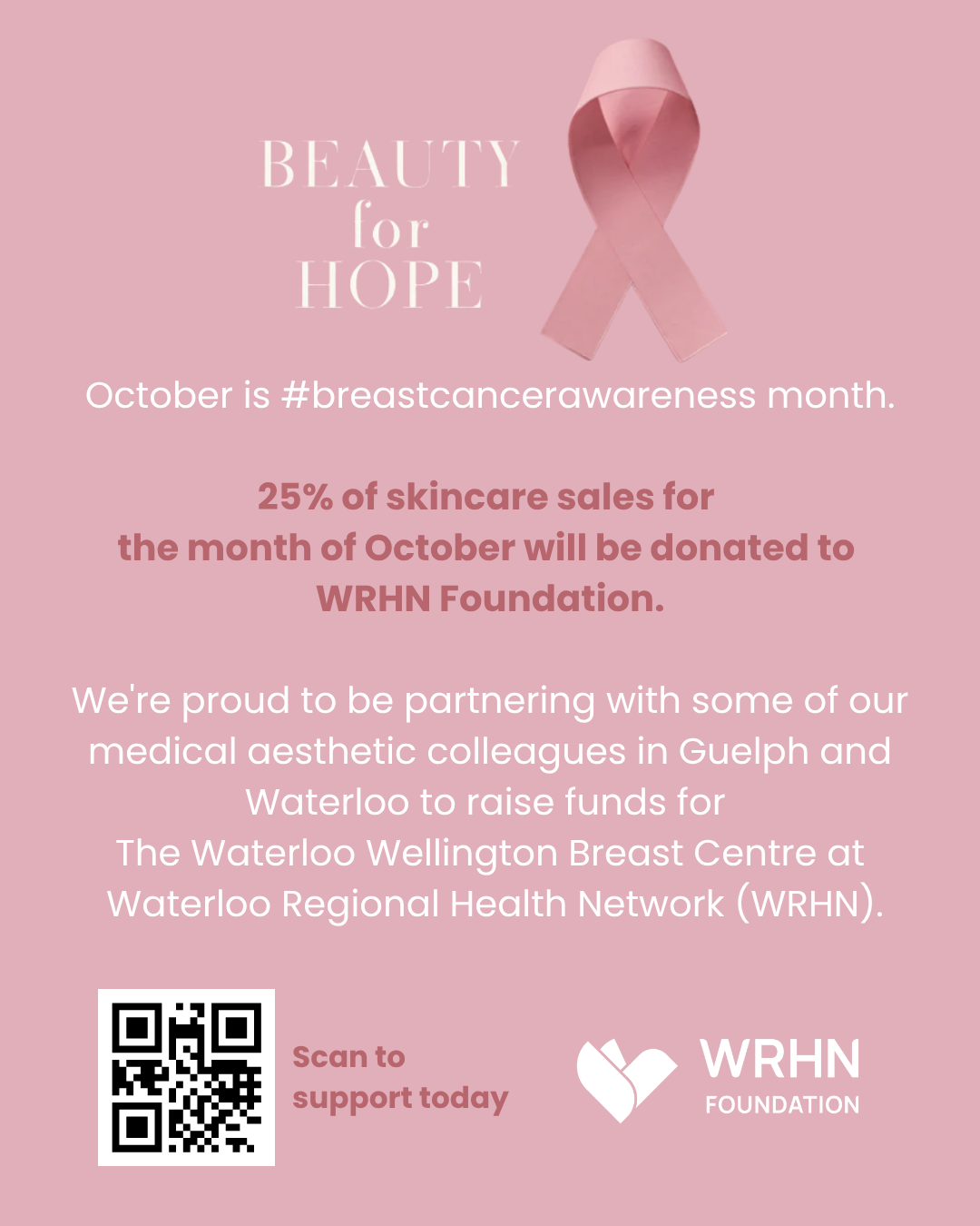 October is Breast Cancer Awareness month and we are pleased to announce our third annual Beauty for Hope collaboration.Breast cancer impacts some of the most important people in our lives -- our mothers, wives, sisters, grandmothers and more -- with 1 in 8 diagnosed with the disease in their lifetime.This October, we're proud to be partnering with some of our medical aesthetic colleagues in Guelph and Waterloo to raise funds for The Waterloo Wellington Breast Centre at Waterloo Regional Health Network (WRHN).